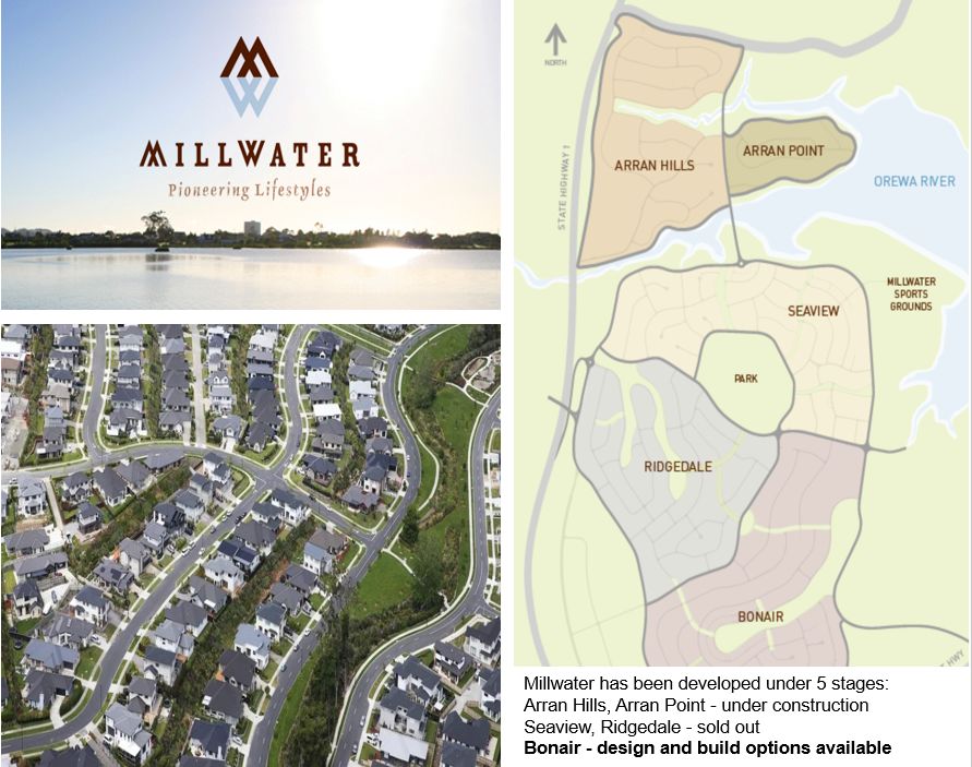 This community is situated between Silverdale and Orewa, with links to the Northern motorway and just 10 minutes from Albany. Developed around tranquil rivers, rolling hills, parks and playing fields, a growing business centre and a selection of top quality educational facilities, Millwater offers a bright future for all that settle here.